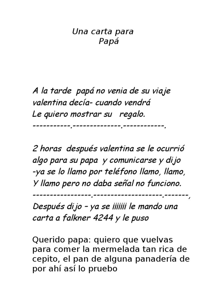 A carta pode ser escrita em qualquer idioma. Por ahora me encuentro en el cuerpo de mami alimentándome, cuida de que coma bien, porque ya sé que casi no come y yo necesito muchas vitaminas. Carta querido padre, decidí mandarte esta carta porque quiero felicitarte de todo corazón, puesto que hoy se celebra un día muy especial para todos tus seres queridos. Me han dicho que tú serás mi papá, y quería decirte que después de tanto tiempo!! 31 de marzo de 2019.